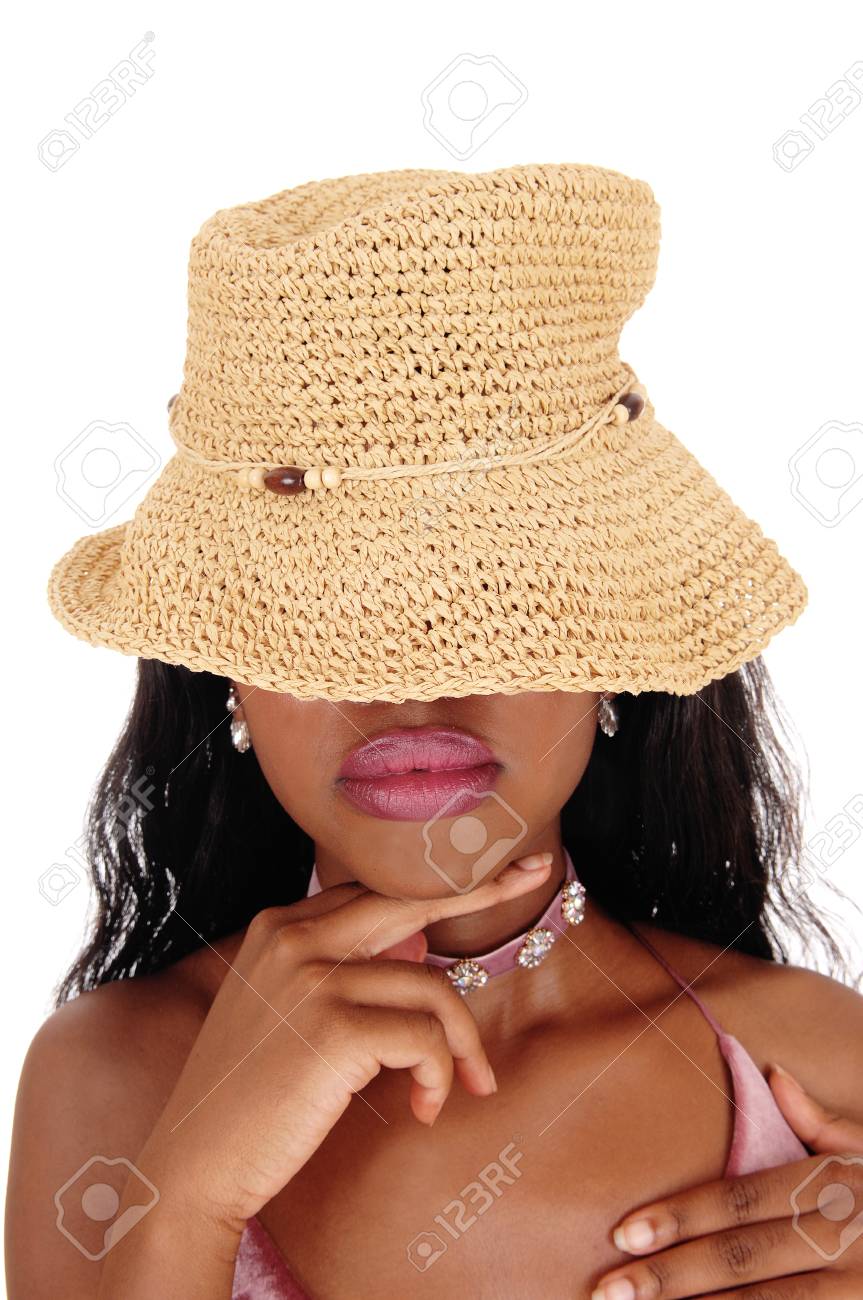 彼女の目の麦わら帽子とアフリカの女性肖像画の立っていると あご聖霊降臨祭の大きな唇 白い背景の分離の下に指 の写真素材 画像素材 Image 88033175