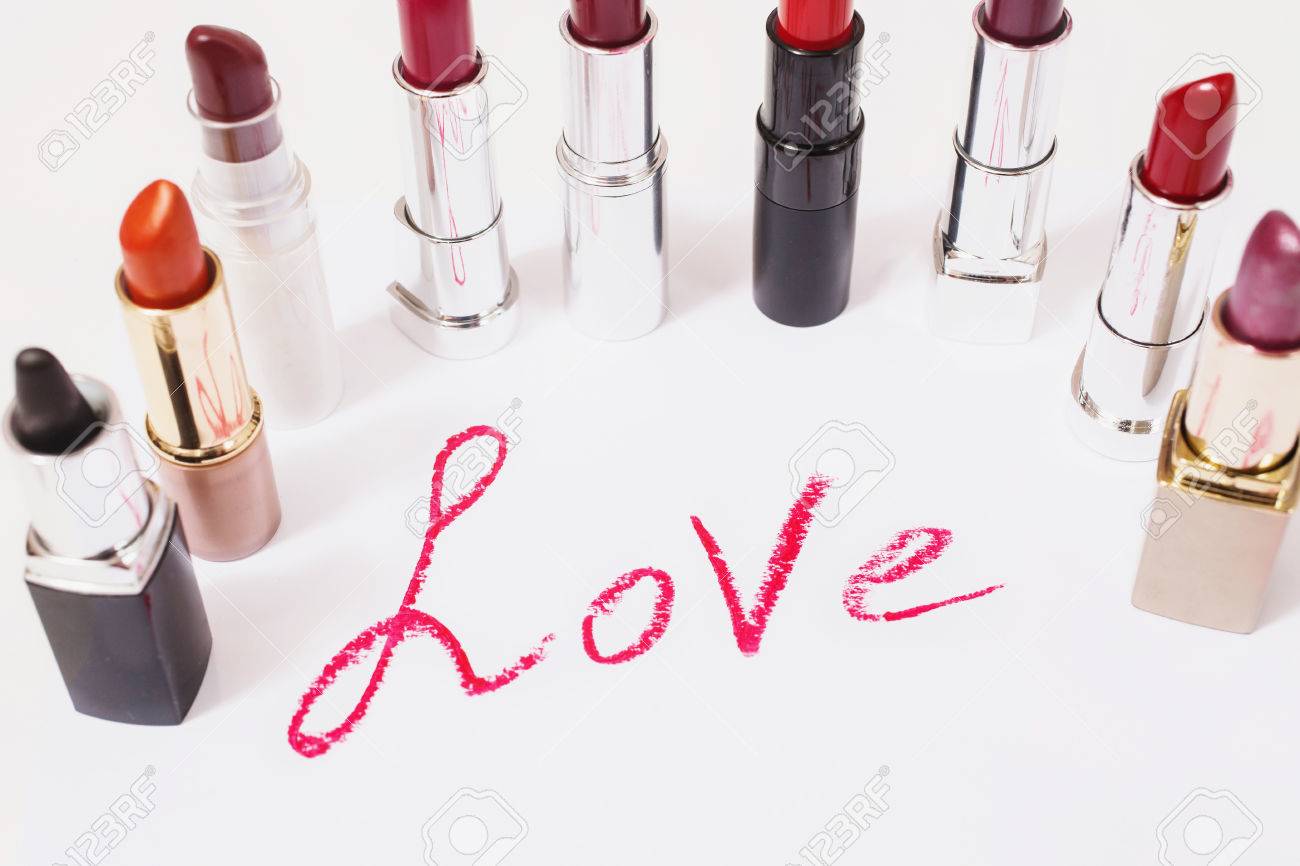 口紅は 白い背景に横たわる 女性のリップ ペンシル 紙の上の唇にキスします 口紅で書かれて単語の愛 鏡に口紅の反射 上からの眺め コンセプトです 装飾的な化粧品 の写真素材 画像素材 Image 71862159