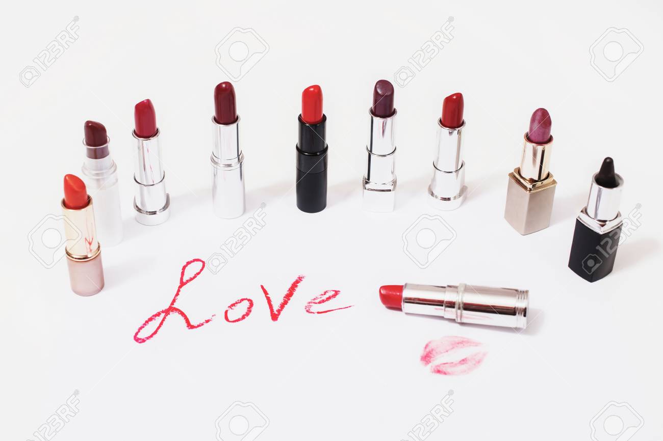 口紅は 白い背景に横たわる 女性のリップ ペンシル 紙の上の唇にキスします 口紅で書かれて単語の愛 鏡に口紅の反射 上からの眺め コンセプトです 装飾的な化粧品 の写真素材 画像素材 Image 71862159