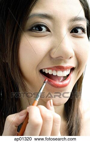 女性の 微笑 カメラにおいて 口紅をつける で 唇ブラシ ストックイメージ Ap01320 Fotosearch