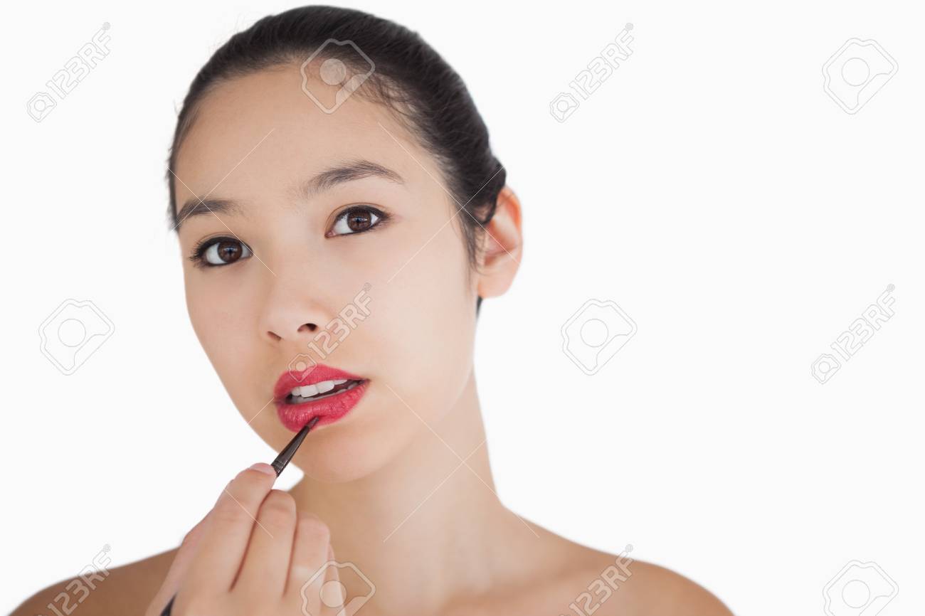 ブラシを使用した白い背景に口紅をつける女 の写真素材 画像素材 Image 16069615