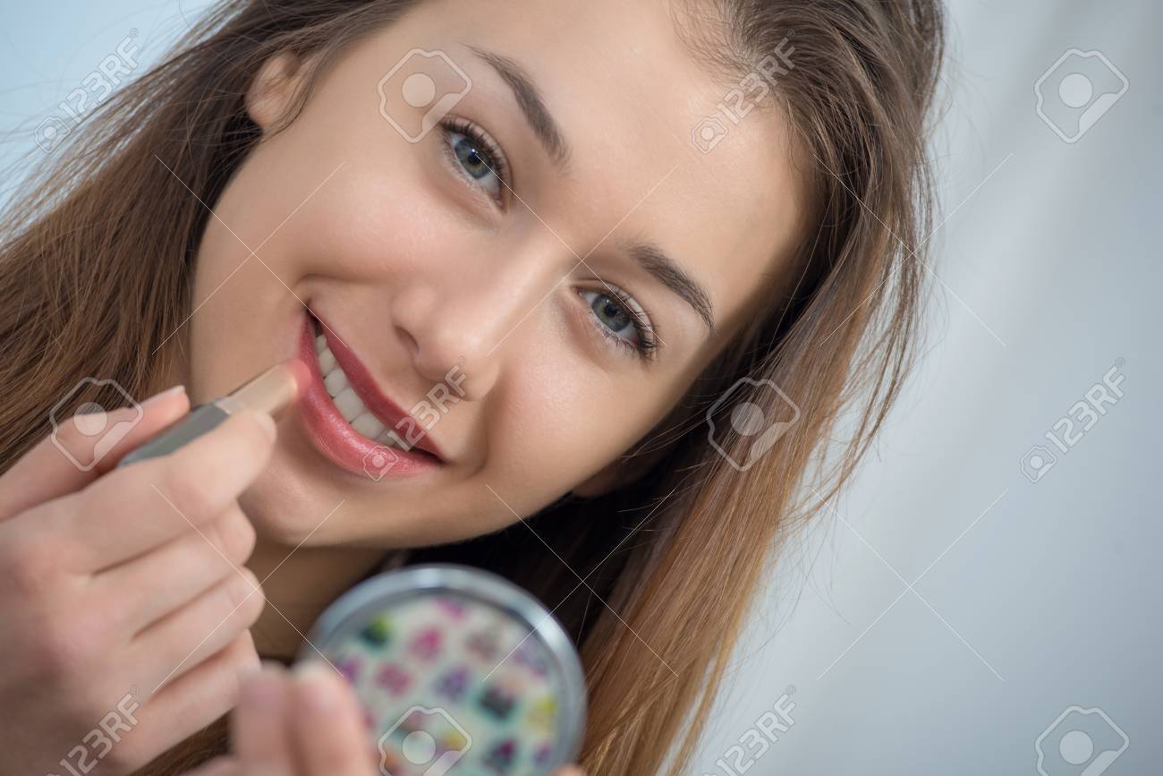 口紅をつけている若くて笑顔の女性 の写真素材 画像素材 Image 95591417
