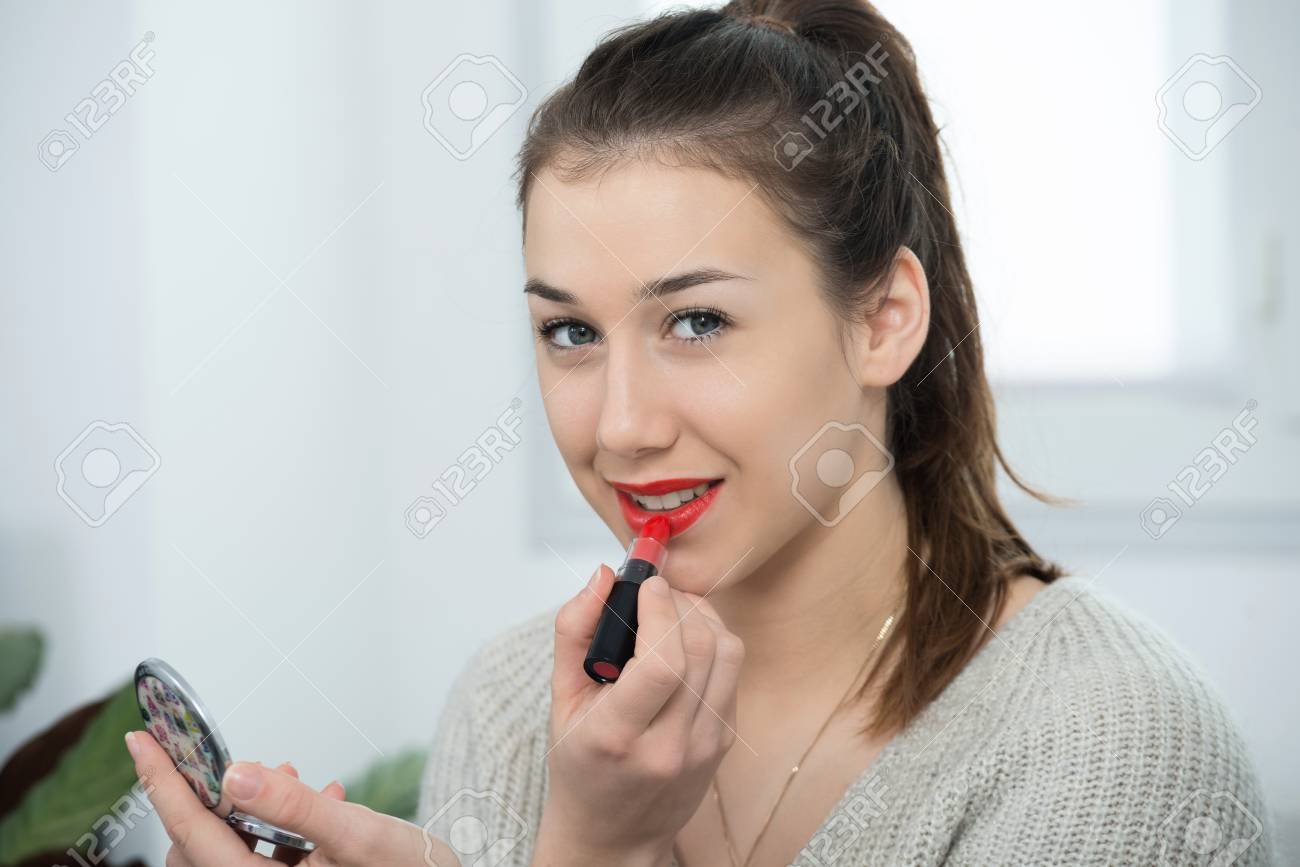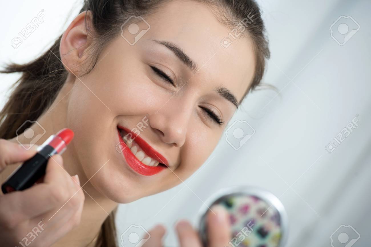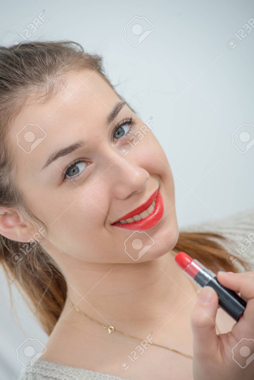 口紅をつけている若くて笑顔の女性 の写真素材 画像素材 Image 95633205