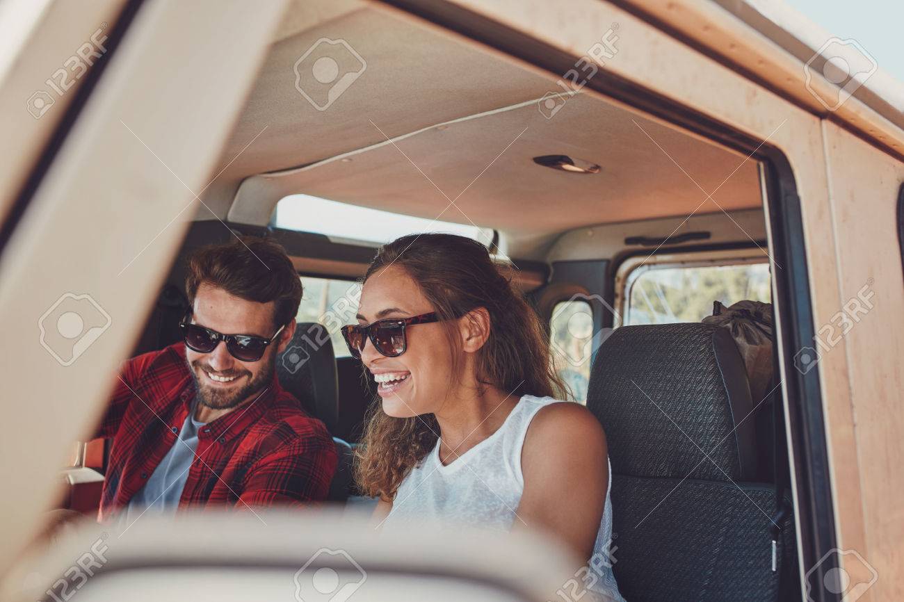 ロードト リップ中に自分の車に座っている若いカップル 若い男と女が車の中に座っていると笑顔のサングラスをかけています の写真素材 画像素材 Image 54201855