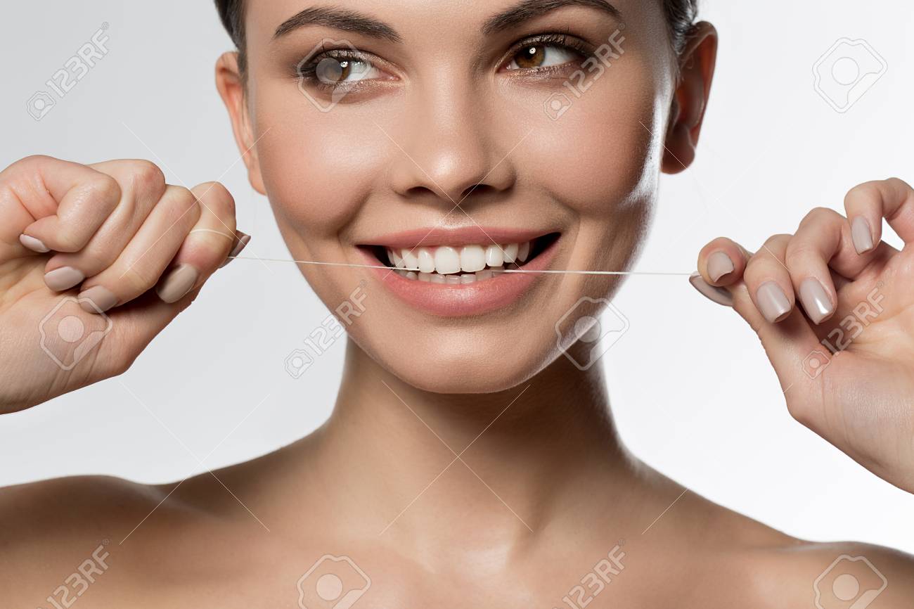 彼女の口腔の世話をする喜びの若い女性の肖像画をクローズアップ 彼女は歯のフロスと笑顔で歯に触れています 分離 の写真素材 画像素材 Image 97245499