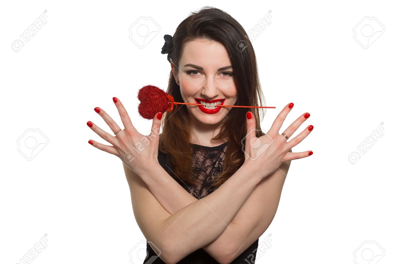 官能的な女性彼女の口の中の歯でバレンタインの心を押し赤い口紅 黒のドレスに赤い爪を表示 の写真素材 画像素材 Image 35251017