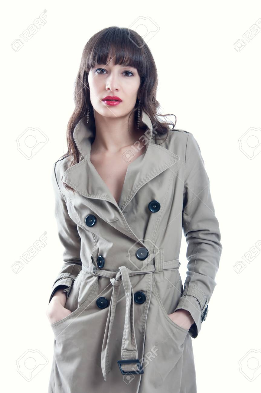 ロック ストレート フリンジ赤い口紅とカメラ目線の雨コートを着て長い髪を持つ美しい若いブルネットの女性モデル 白い背景に分離 の写真素材 画像素材 Image 26093940