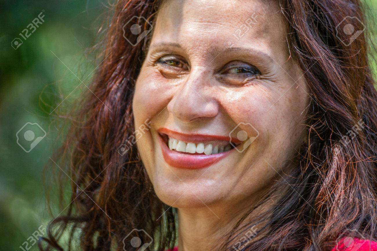笑顔の肖像画 長いウェーブのかかった赤味がかった茶色の髪 赤い口紅持つ幸せな熟女 の写真素材 画像素材 Image 59959694