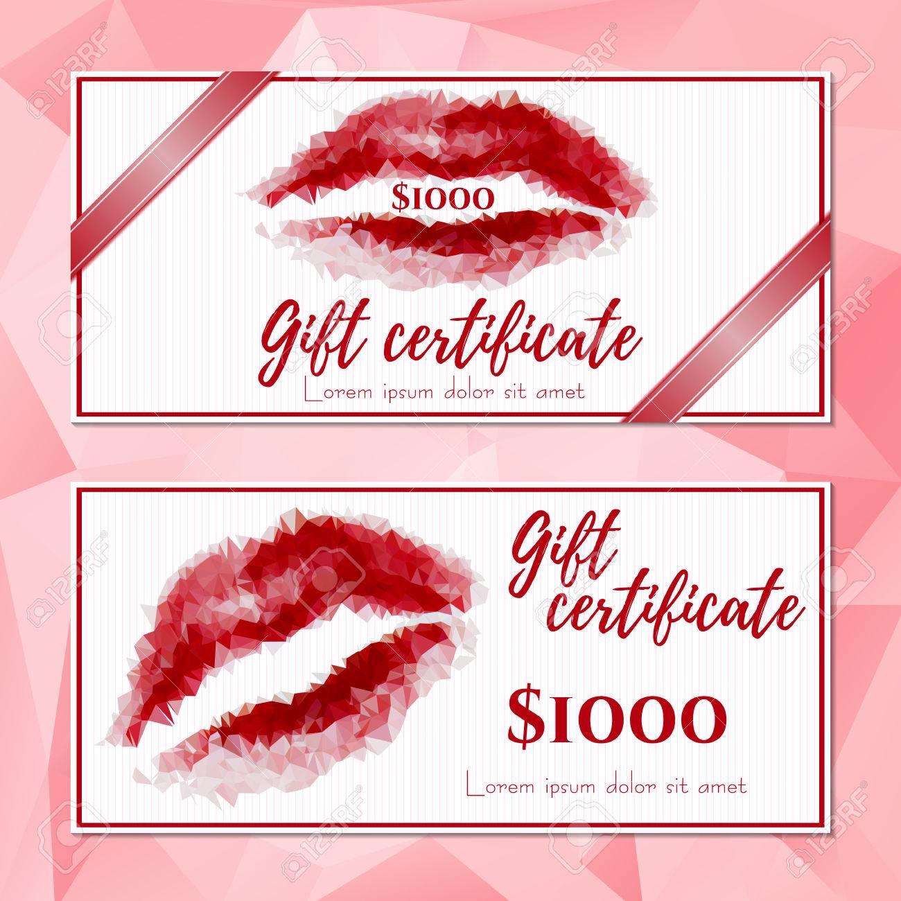 ギフト券を多角形の赤い唇の 2 つのバージョンのテンプレートがファッション 化粧品店でプレゼント用の証明書 美容製品のマーケティングします 多角形 ピンクの背景 ベクトル図のイラスト素材 ベクタ Image 55720684