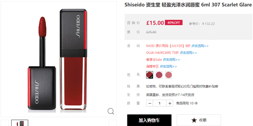 新低补货 Shiseido资生堂18年秋季唇蜜漆光唇釉307色 凑单折后价 16 46 约126元 拔草哦