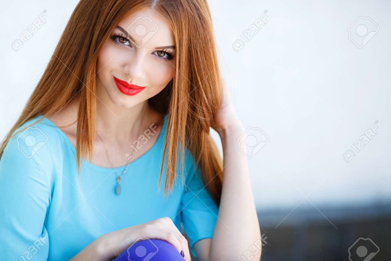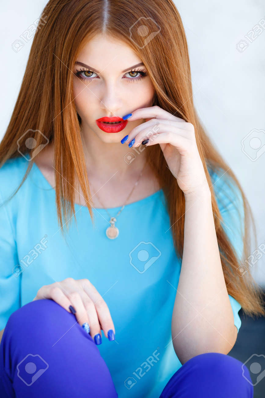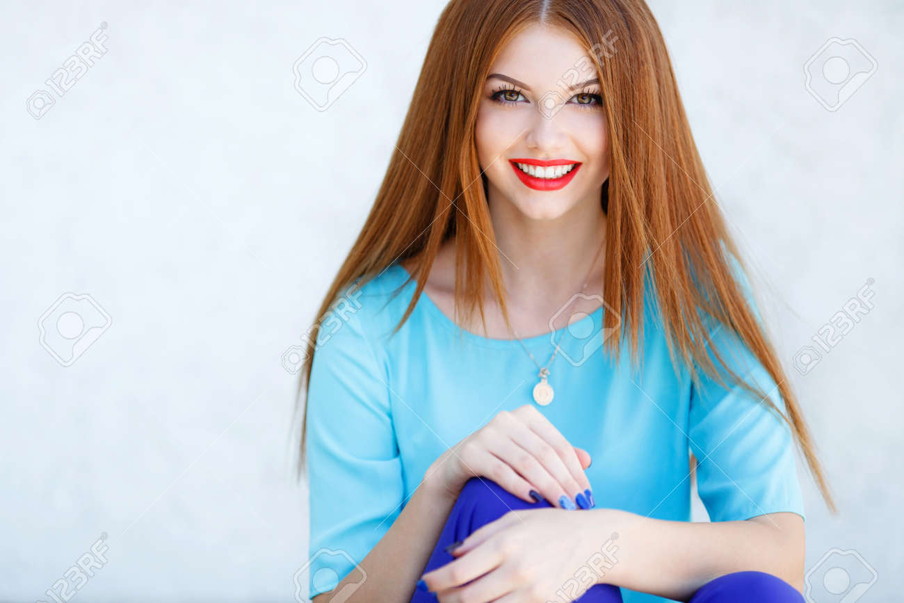若い美しい女性の長い赤い髪と瞳 赤い口紅 青いマニキュア ブルーのブラウスと青いズボンを身に着けている 美しい笑顔 首には戸外で白い壁に対して夏の円形浮彫り肖像画 の写真素材 画像素材 Image 52960386