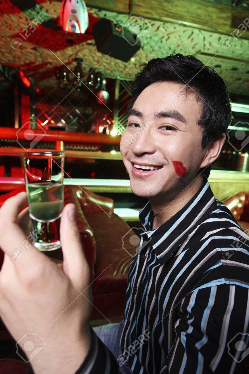ショット グラスを保持している彼の頬に口紅の印を持つ男 の写真素材 画像素材 Image 26229067